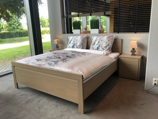 Een complete slaapkameropstelling; eiken-ledikant, Auping spiraalbodem (vlak), matrassen, eiken-nachtkastjes.