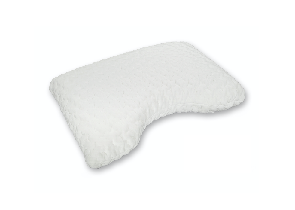 Hoogwaardig gezondheidskussen met ingebouwde nekondersteuning en schouderuitsparing. Door dit ingenieuze zonesysteem kantelt het hoofd naar achteren. Hierdoor worden nekwervels optimaal ondersteund in de natuurlijke houding, komen zenuwbanen tot rust en liggen de luchtwegen vrij. Ook bij een totale spierontspanning valt het hoofd nooit opzij.