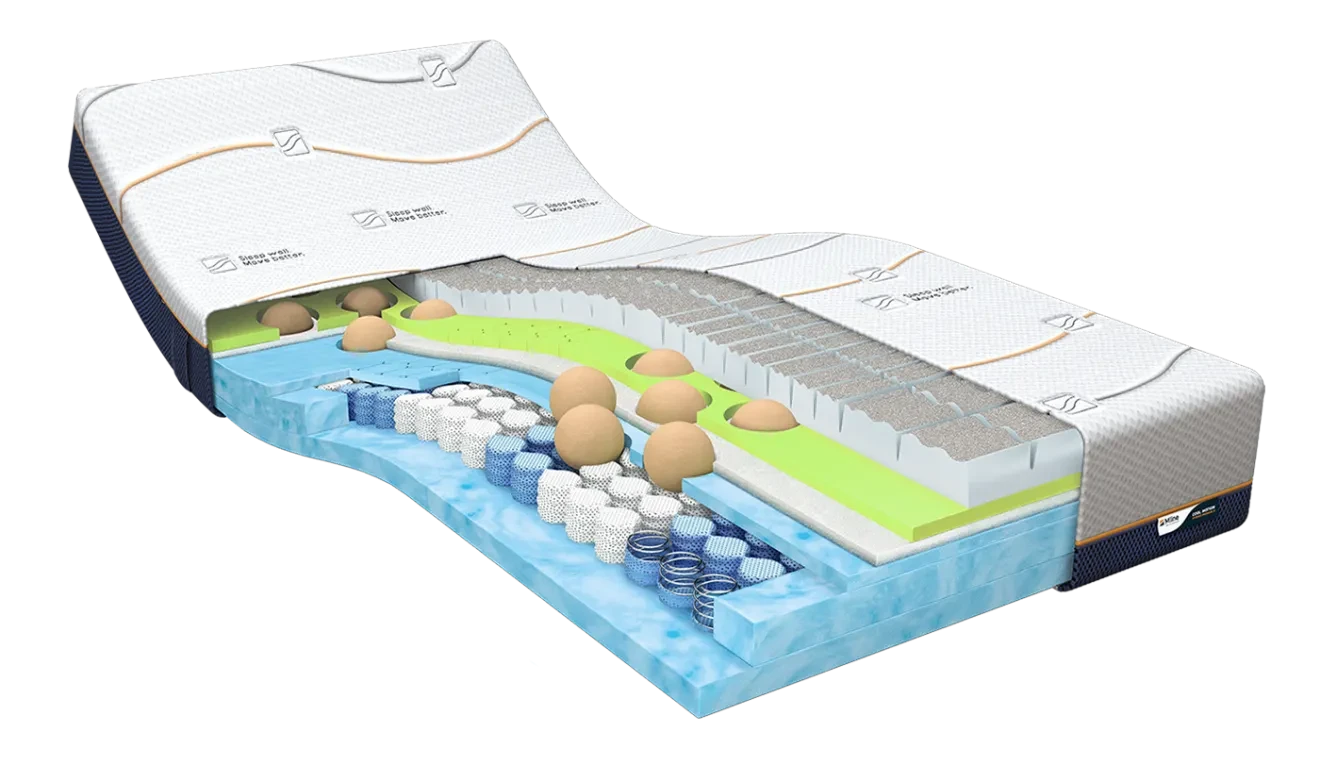 De M line Cool Motion 8 is een premium 'Hybrid' matras, populair bij topsporters en fysiotherapeuten, met een 8-zones pocketvering basis, visco-elastisch schuim in de bovenlaag, en schuimbollen voor optimale ondersteuning en bewegingsvrijheid tijdens de slaap.