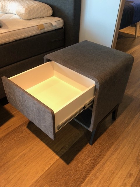 Nachtkast Gent is volledig gestoffeerd, verder beschikt deze nachtkast over een stalen onderstel.