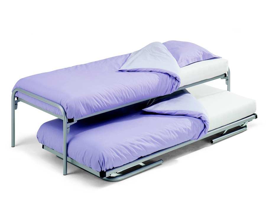 Logeren wordt een luxe met het dubbeldivan bed Twin. Logés genieten van extra comfort door de optimale ondersteuning van de dwarsgespannen spiralen. Het boven- en onderbed hebben uitgeklapt dezelfde comfortabele bedhoogte.