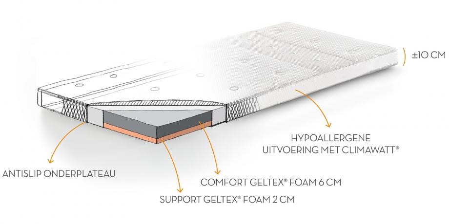 De Hypoallergene oplegmatras heeft een Comfort GELTEX® Foam kern van 8 cm. De totale dikte is 10cm, de tijk van het matras is rond om afritsbaar en te wassen op 40ºC.